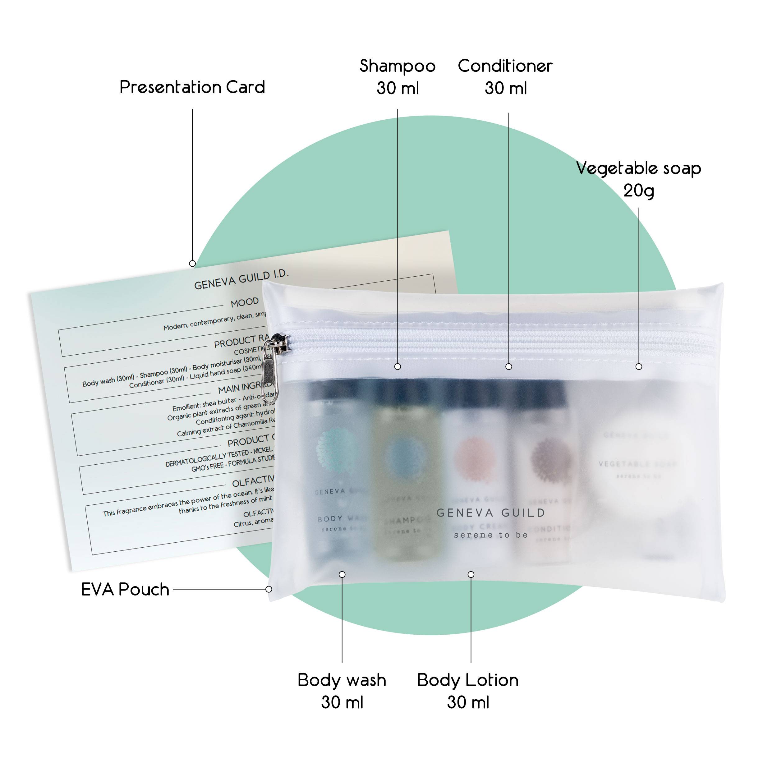 4 x bottles 30 ml: Shampoo, Body Wash, Body Cream, Conditioner