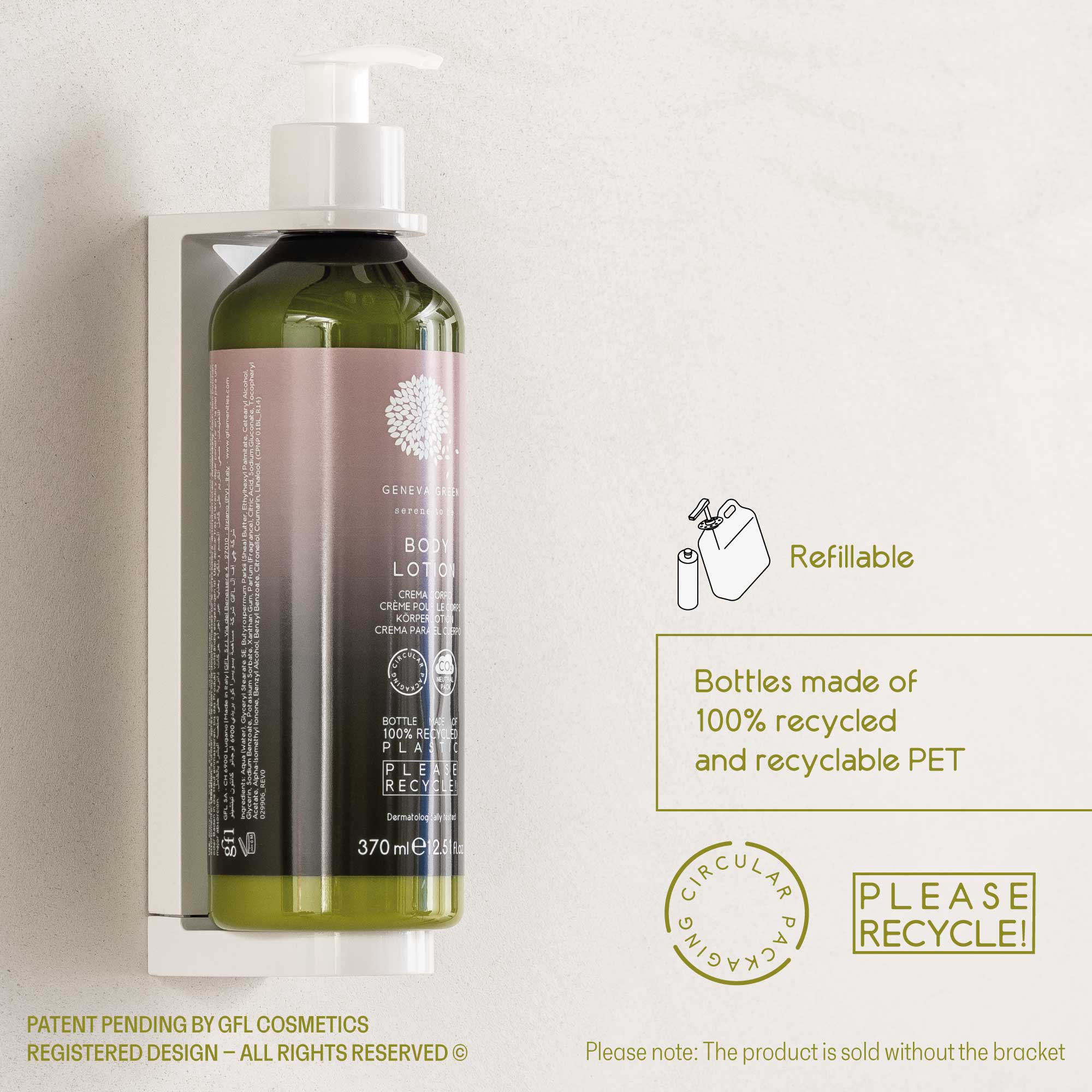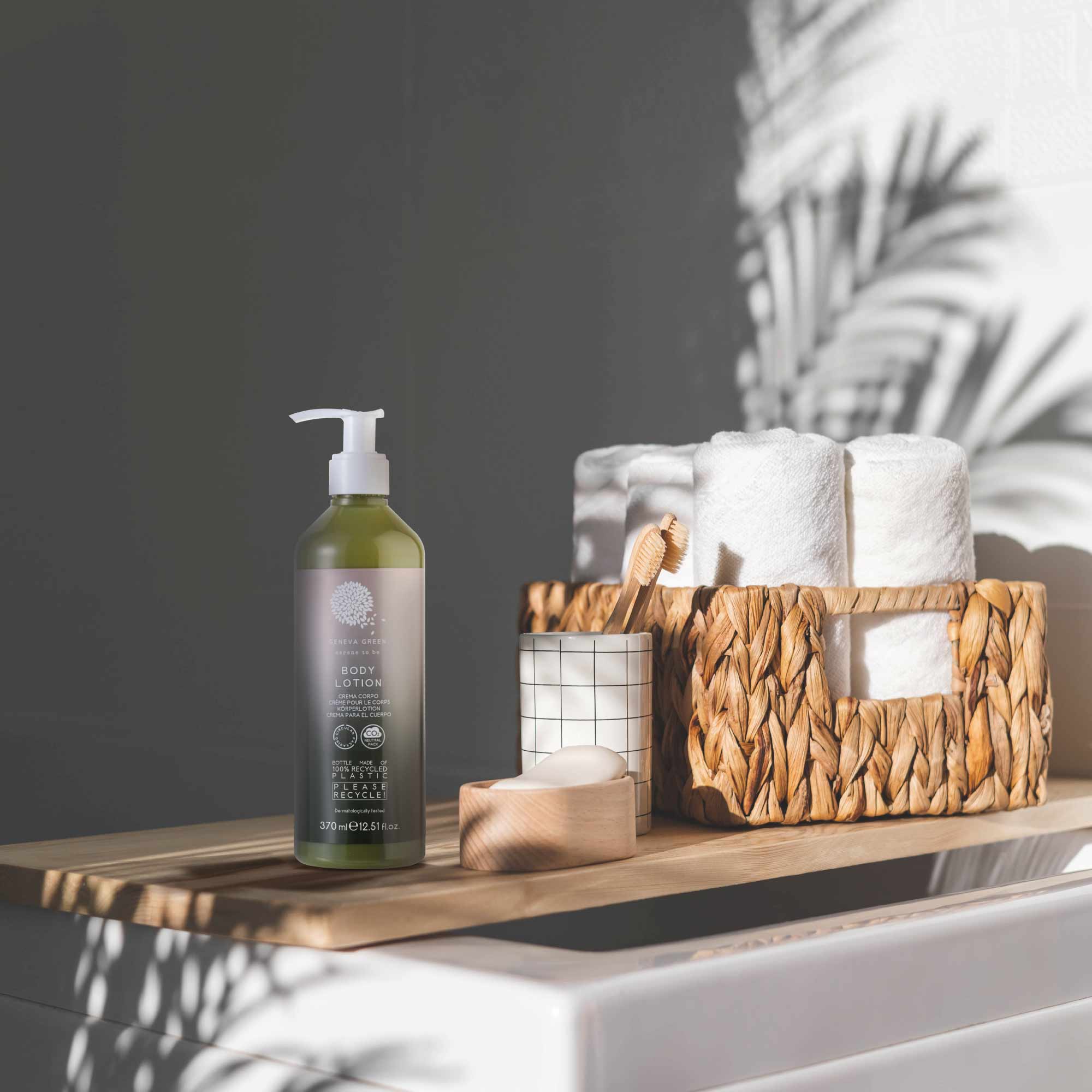 Geneva Green body lotion is enriched with vitamin E and Shea Butter.