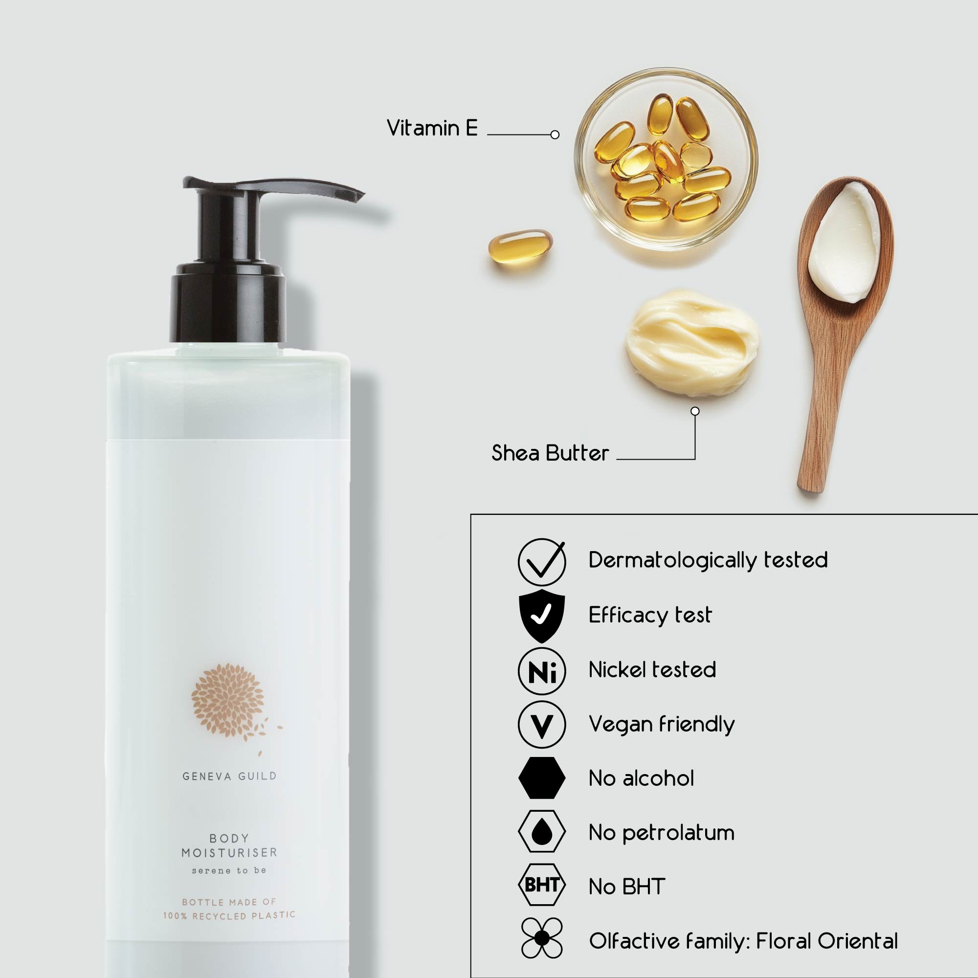 Geneva Guild body moisturiser is enriched with vitamin E and Shea Butter.