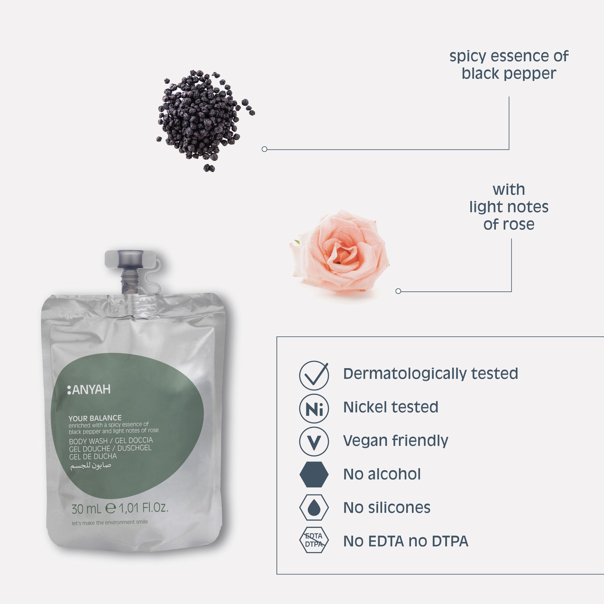 Body wash enriched with a spicy essence of black pepper and light notes of rose, formulated with essentials and active ingredients.