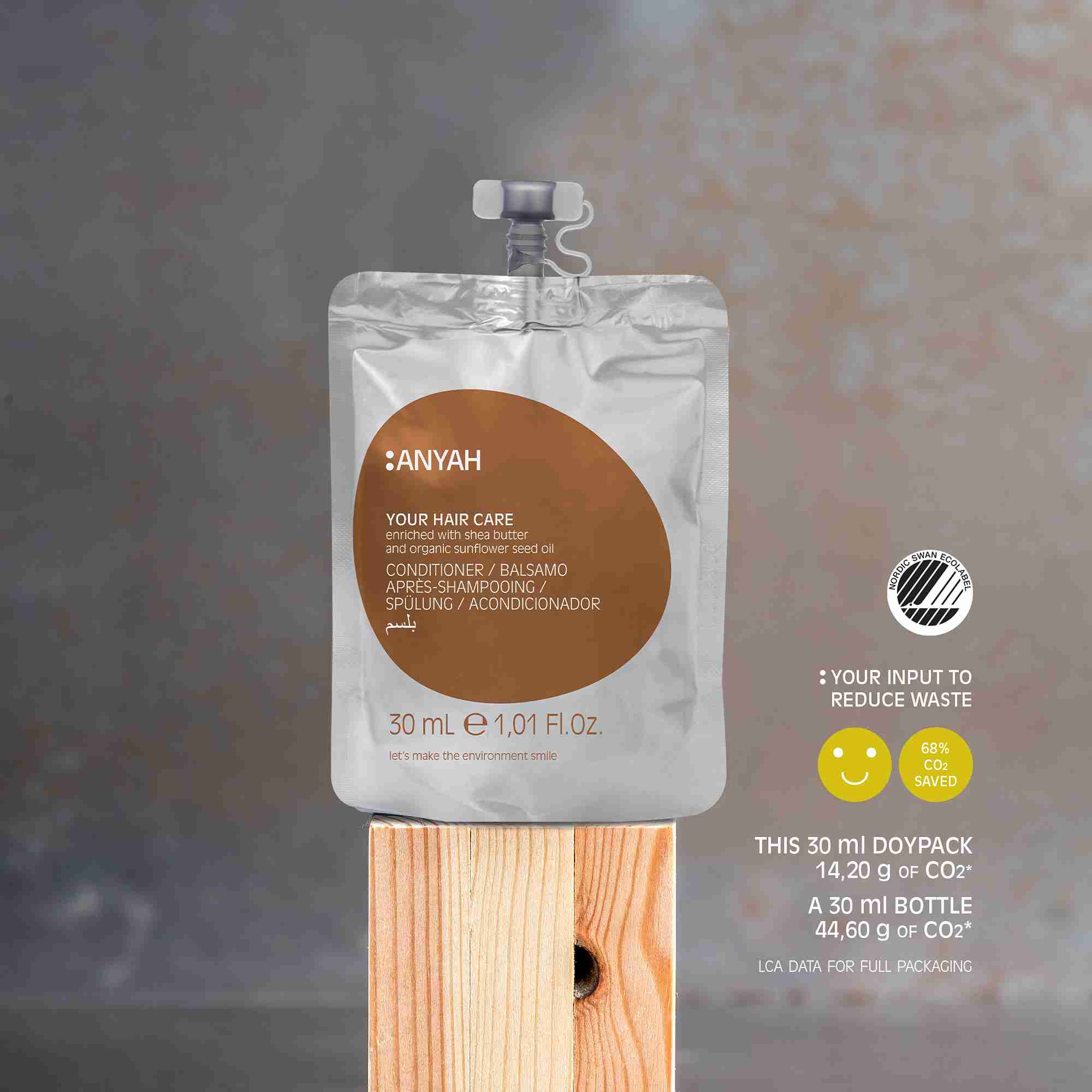 The Anyah range takes into account its environmental impact with a proven Life Cycle assessment shown directly on the label. The Life Cycle Assessment (LCA), is an innovative approach that has allowed us to calculate the environmental impact of Anyah’s packaging along the products entire life cycle.