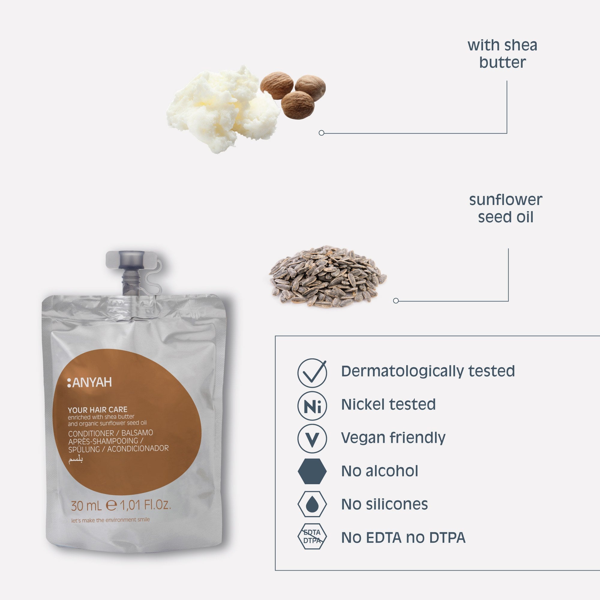 Conditioner enriched with shea butter and organic sunflower seed oil,formulated with essentials and active ingredients. Safe for colour-treated hair, the conditioner delivers ultra-shiny, sleek locks that feel sumptuously softened.
