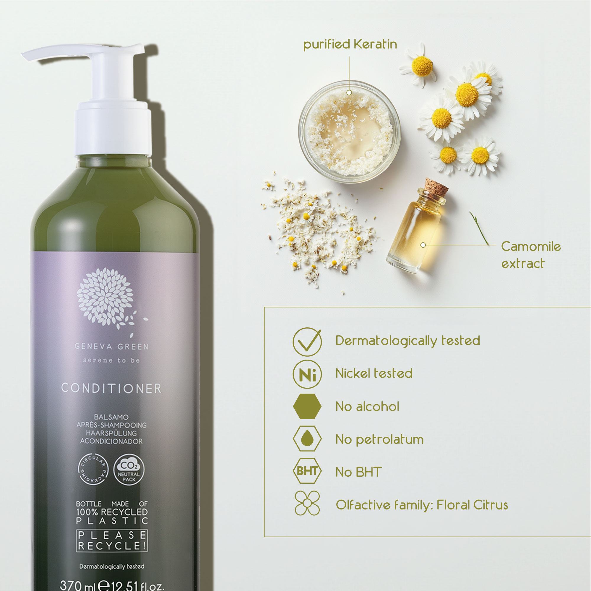 Geneva Green conditioner is enriched with purified Keratin and Camomile extract.