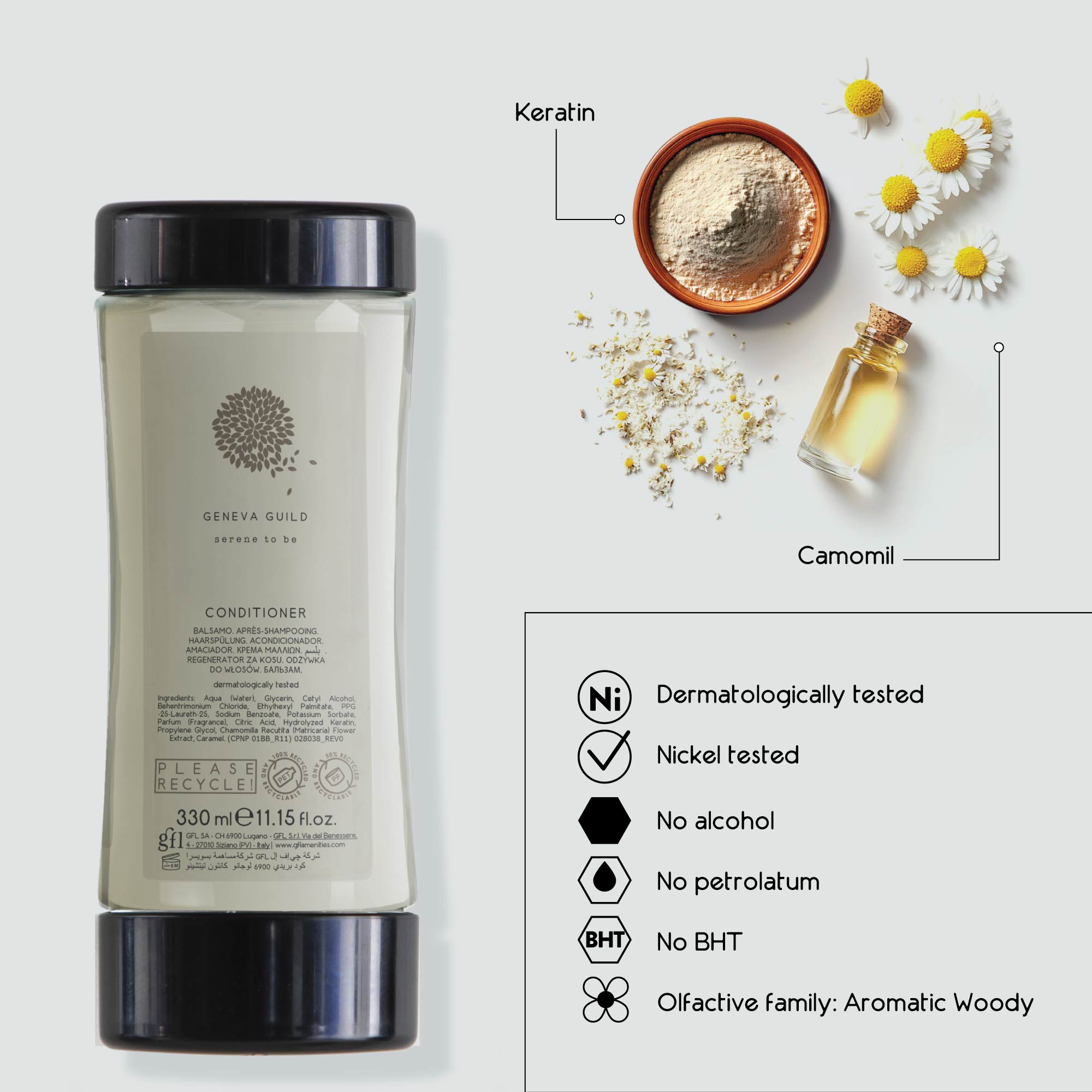 Geneva Guild conditioner is enriched with purified Keratin and Camomile extract.