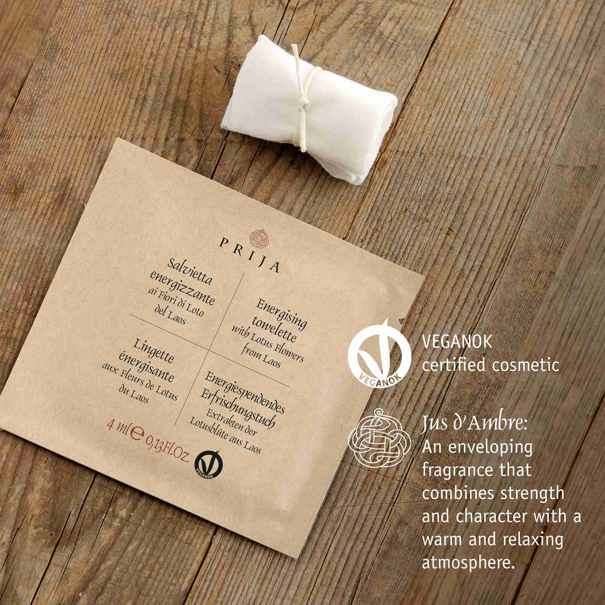 Energising wipe with Lao Lotus Flowers to moisturize and sanitise your skin, giving a pleasant feeling of freshness.