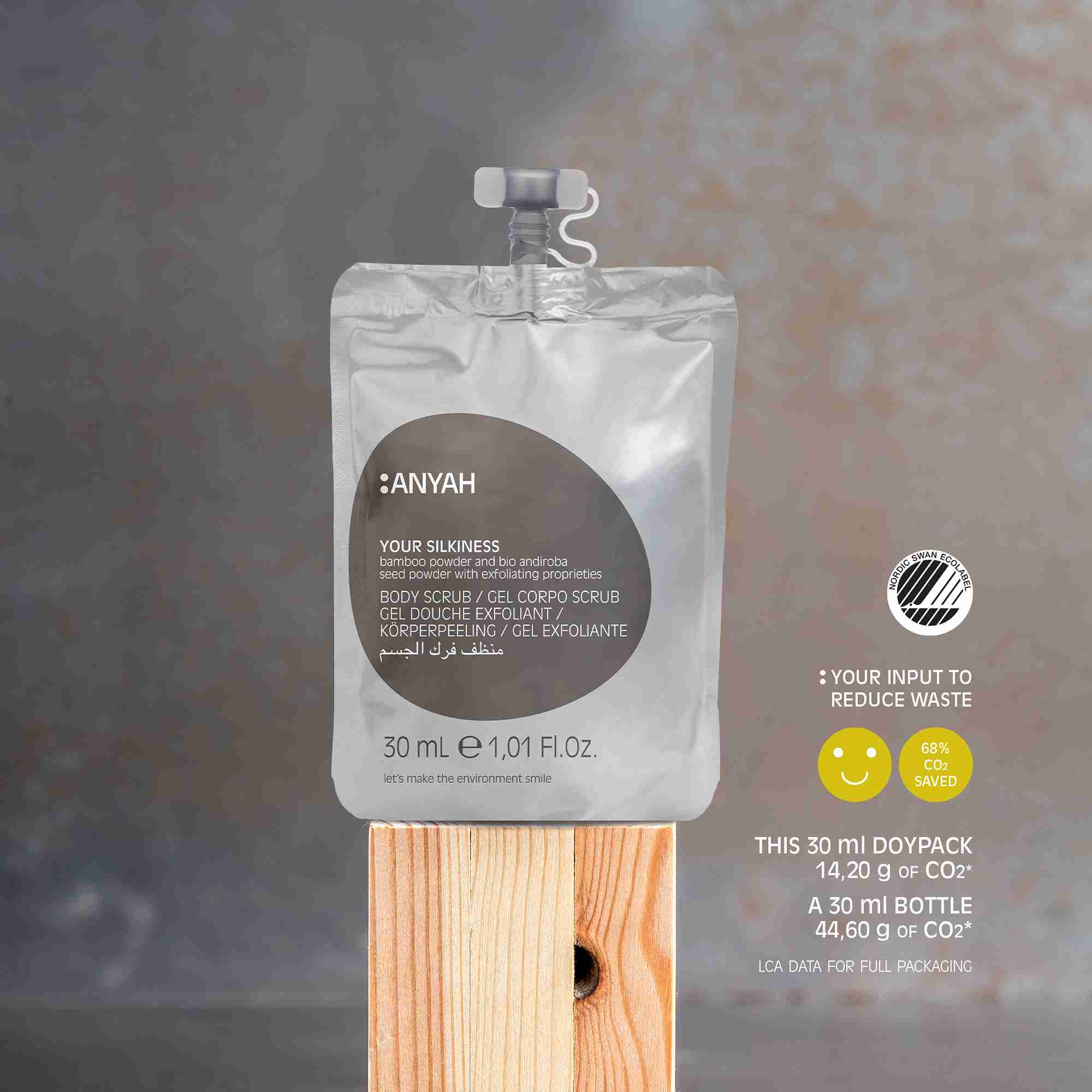 The Anyah range takes into account its environmental impact with a proven Life Cycle assessment shown directly on the label. The Life Cycle Assessment (LCA), is an innovative approach that has allowed us to calculate the environmental impact of Anyah’s packaging along the products entire life cycle.