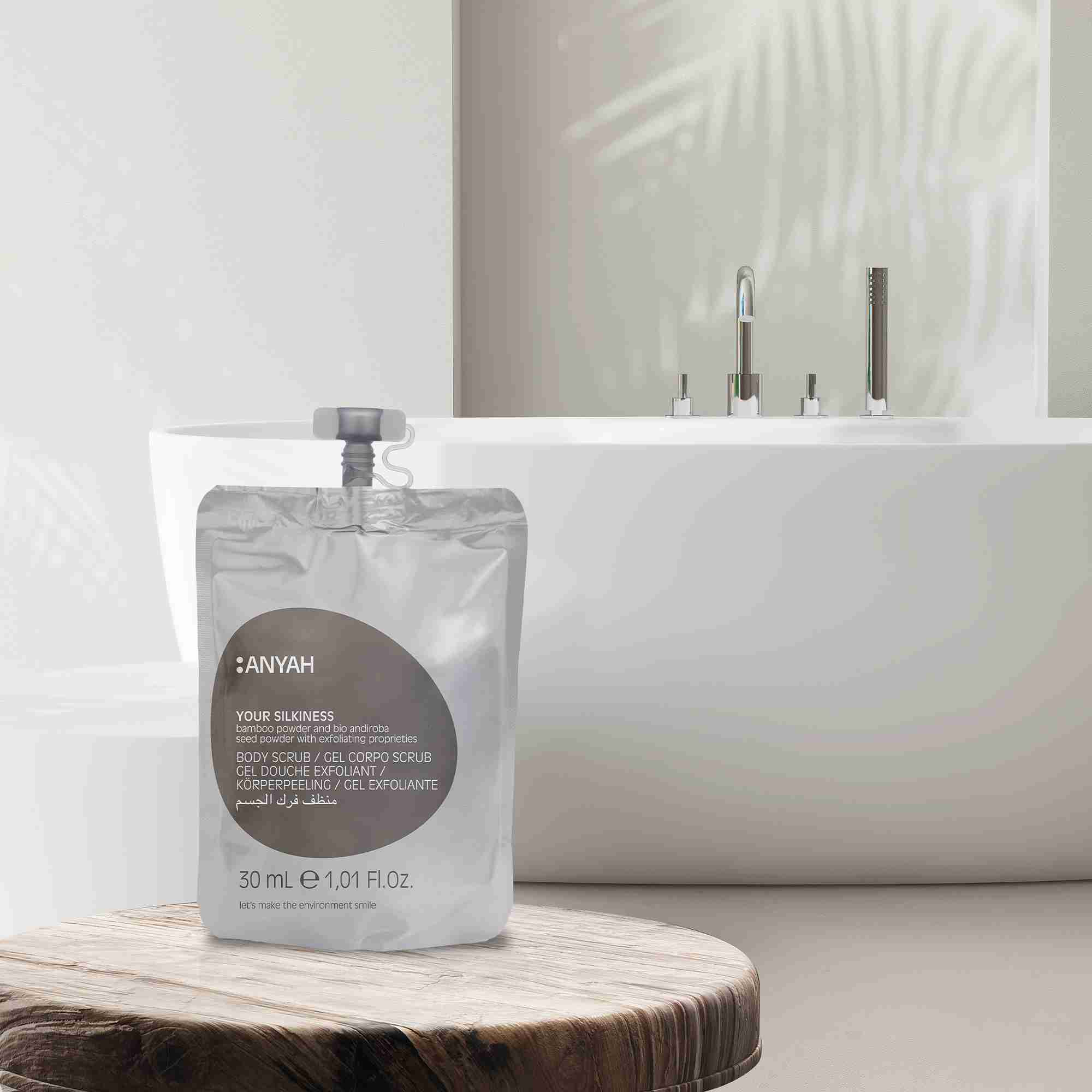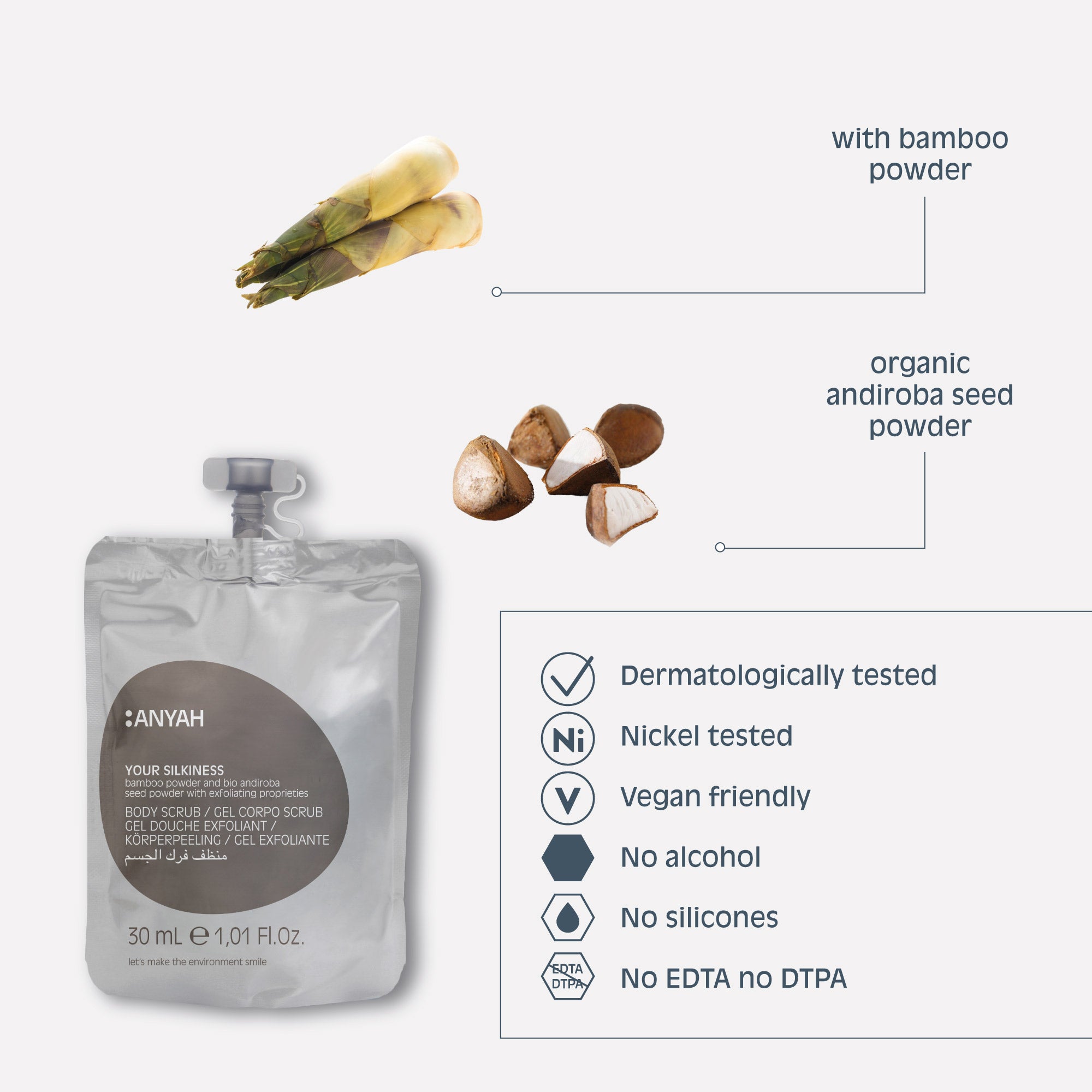 Body scrub with bamboo powder and bio andiroba seed powder providing a natural exfoliating effect. The formula is microbead free and all ingredients are natural allowing you to help conserve marine life and the ecological equilibrium of our planet.