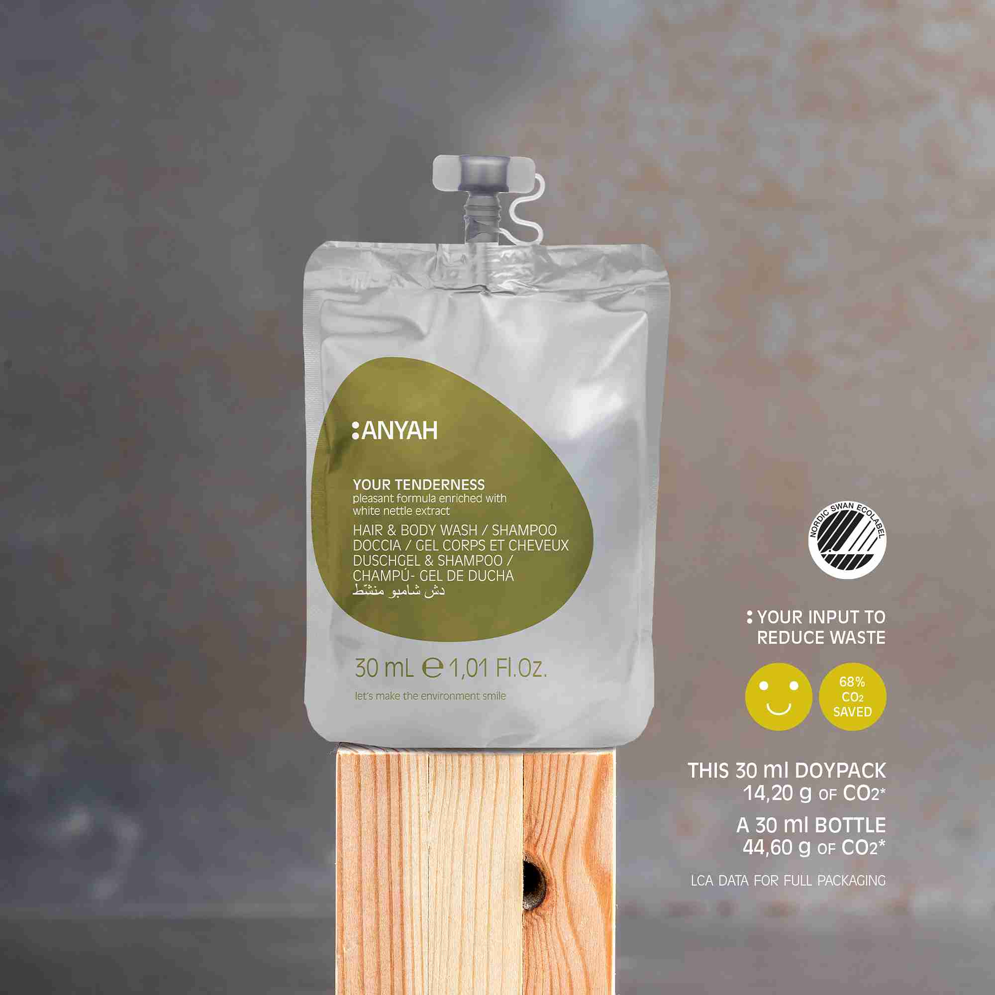 The Anyah range takes into account its environmental impact with a proven Life Cycle assessment shown directly on the label. The Life Cycle Assessment (LCA), is an innovative approach that has allowed us to calculate the environmental impact of Anyah’s packaging along the products entire life cycle.