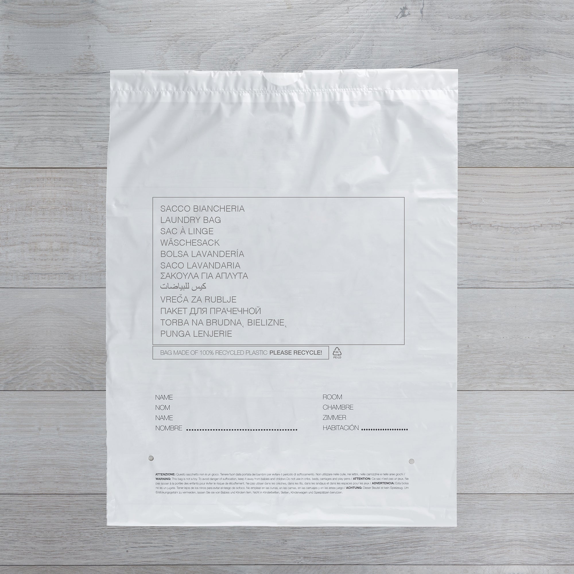 No Logo laundry bag in recycled PE with PE string, with room references.