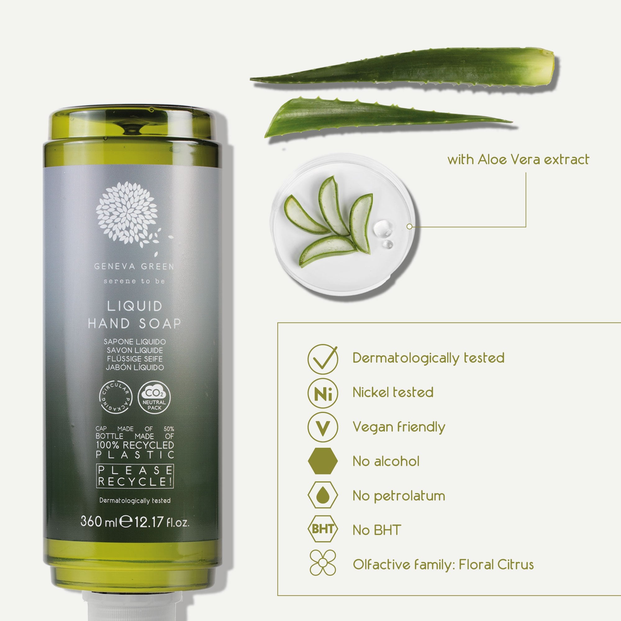 Geneva Green liquid hand soap gently cleans the skin, the lightly scented formula is enriched with Aloe Vera extract.