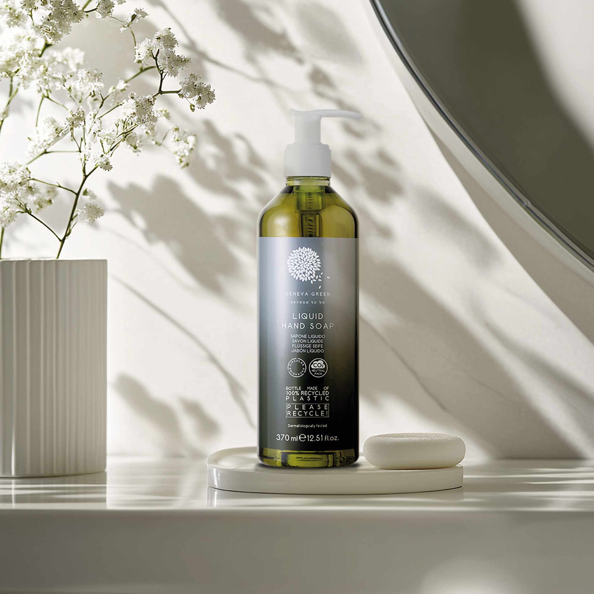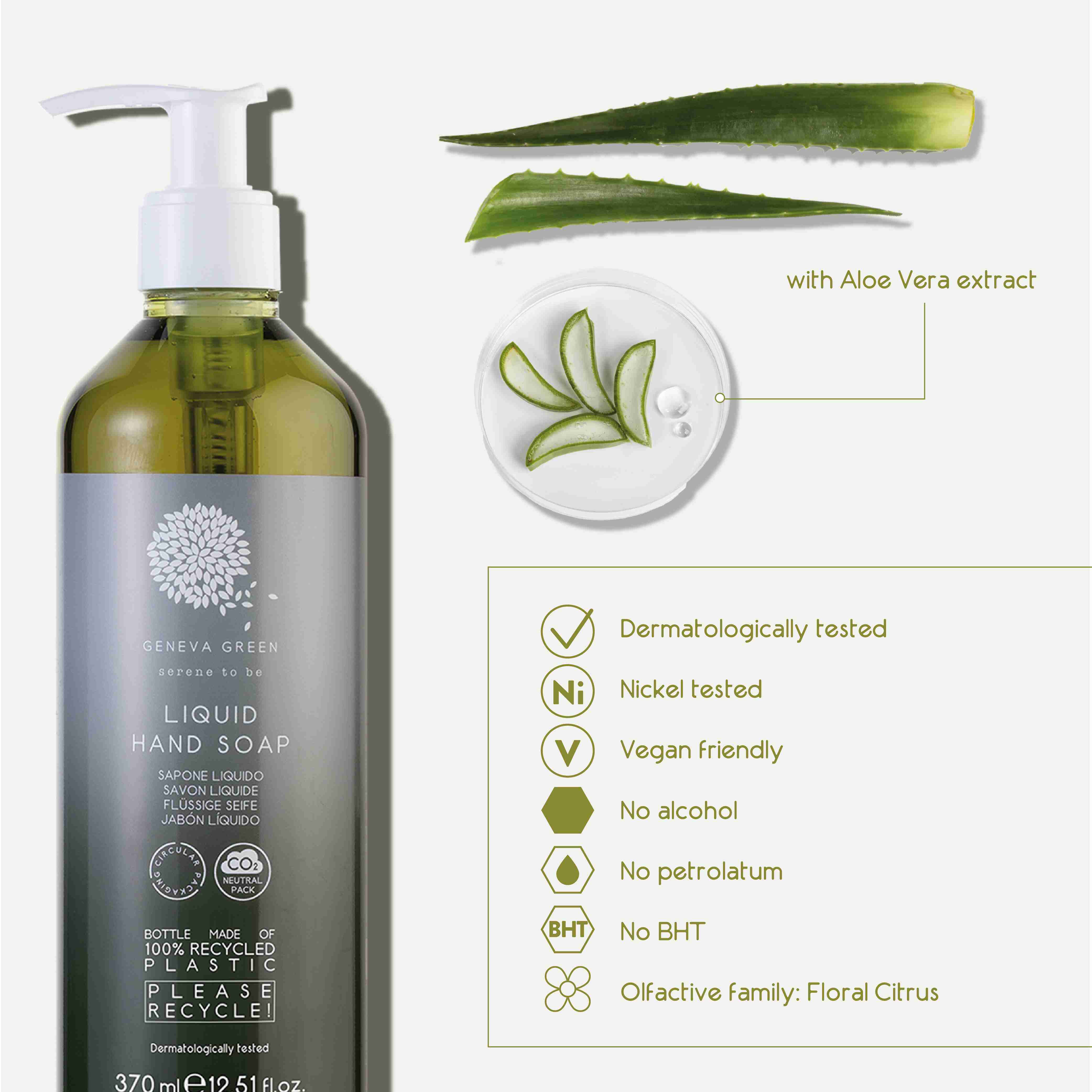 Geneva Green liquid hand soap gently cleans the skin, the lightly scented formula is enriched with Aloe Vera extract.
