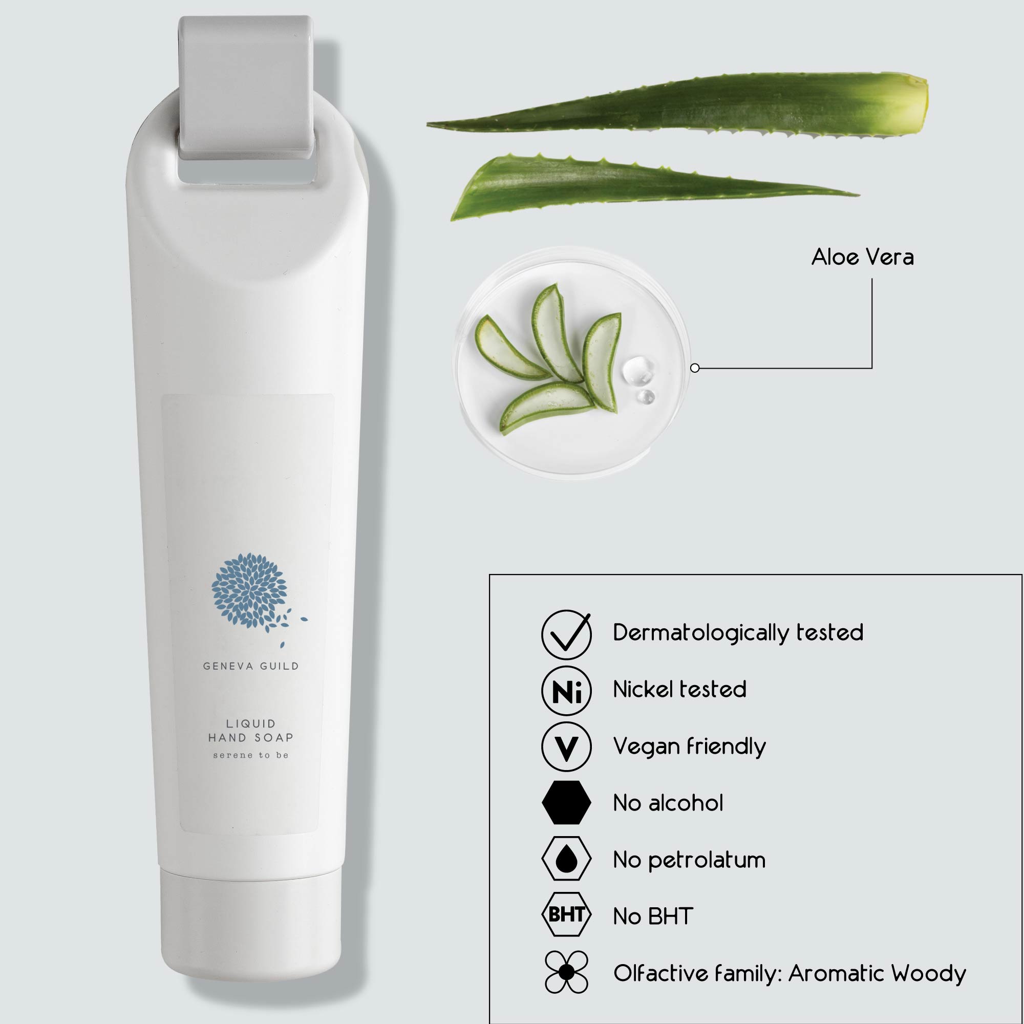 Geneva Guild liquid hand soap gently cleans the skin, the lightly scented formula is enriched with Aloe Vera extract.