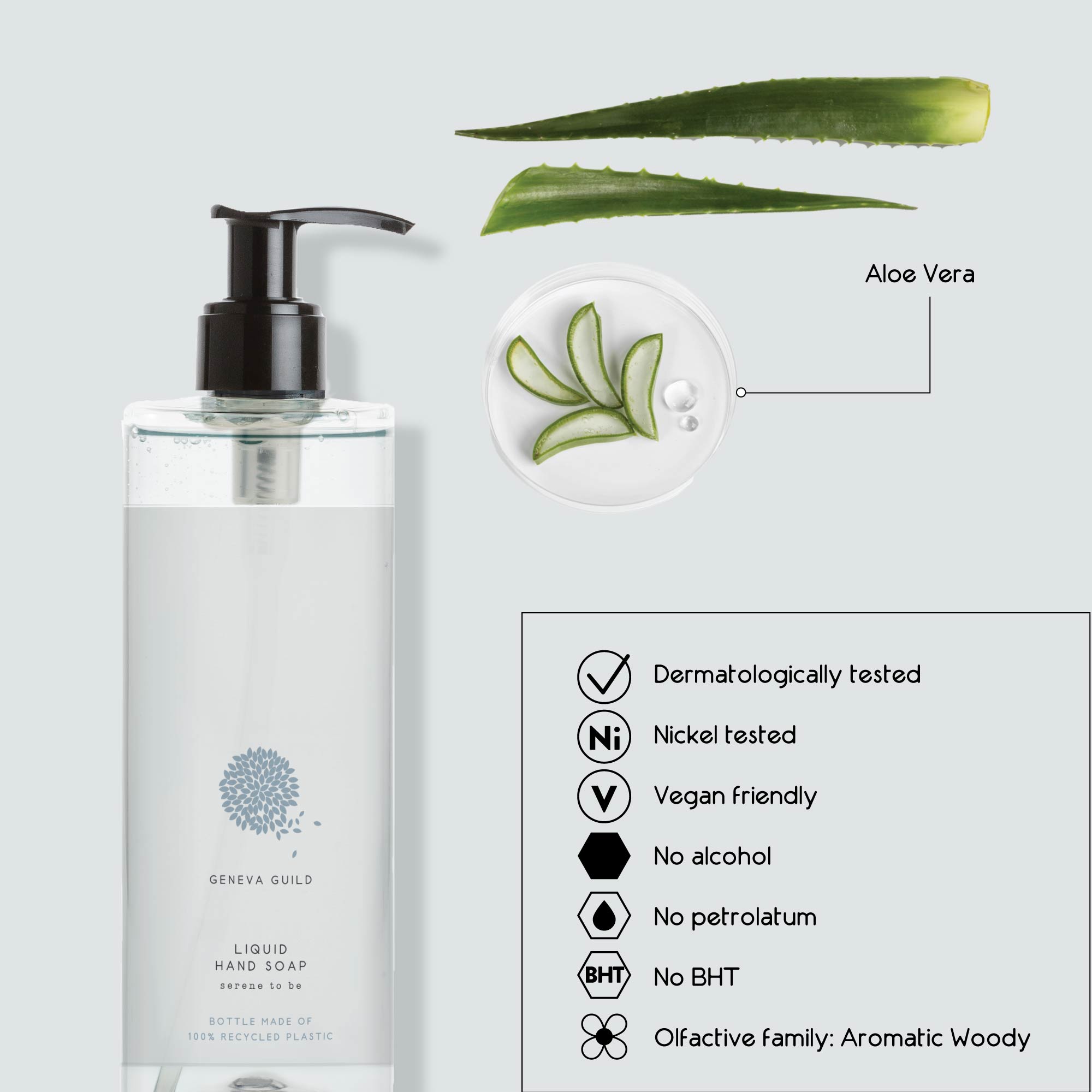 Geneva Guild liquid hand soap gently cleans the skin, the lightly scented formula is enriched with Aloe Vera extract.