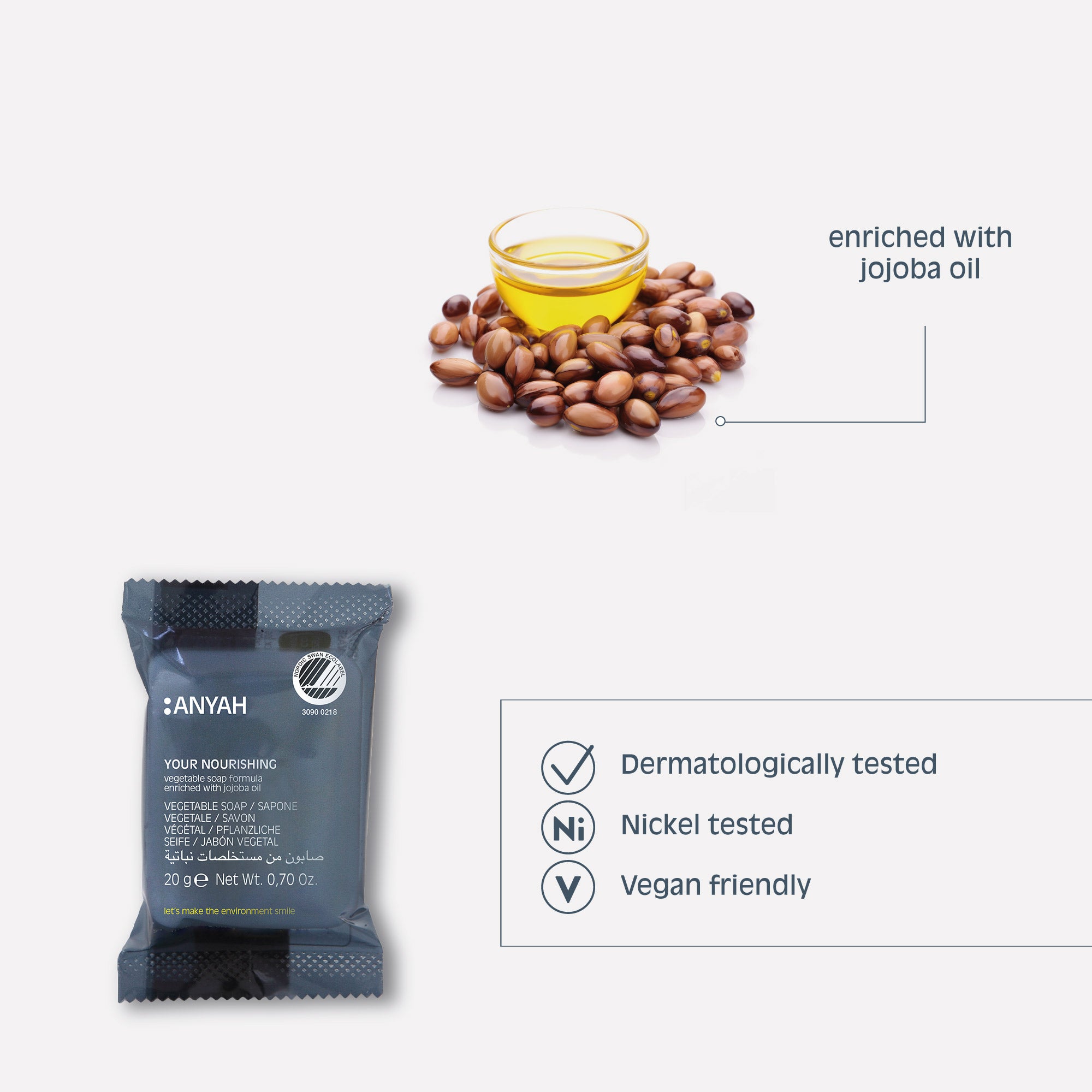 Vegetable soap enriched with jojoba oil, formulated with essentials and active ingredients.