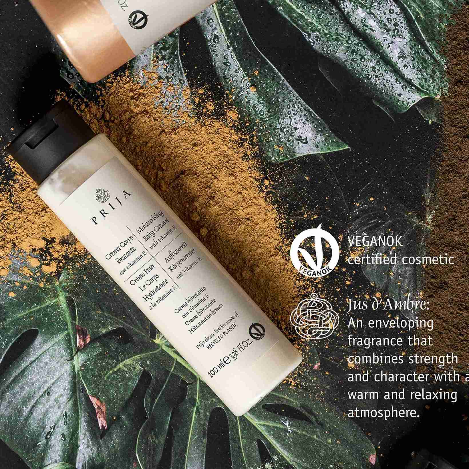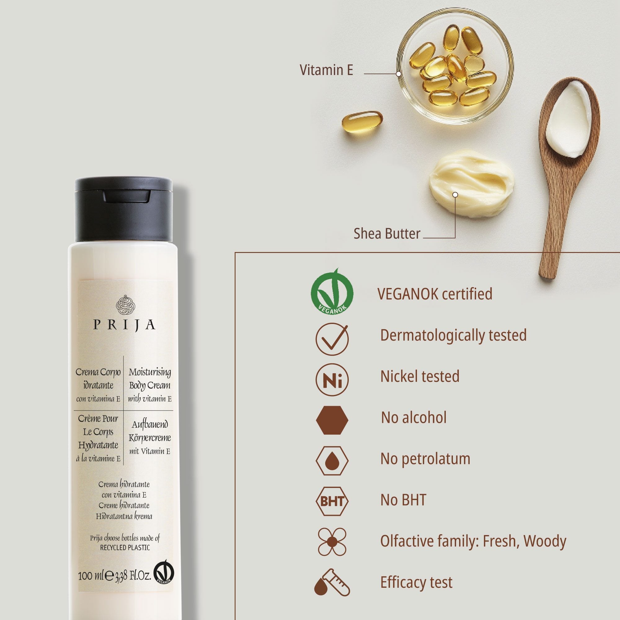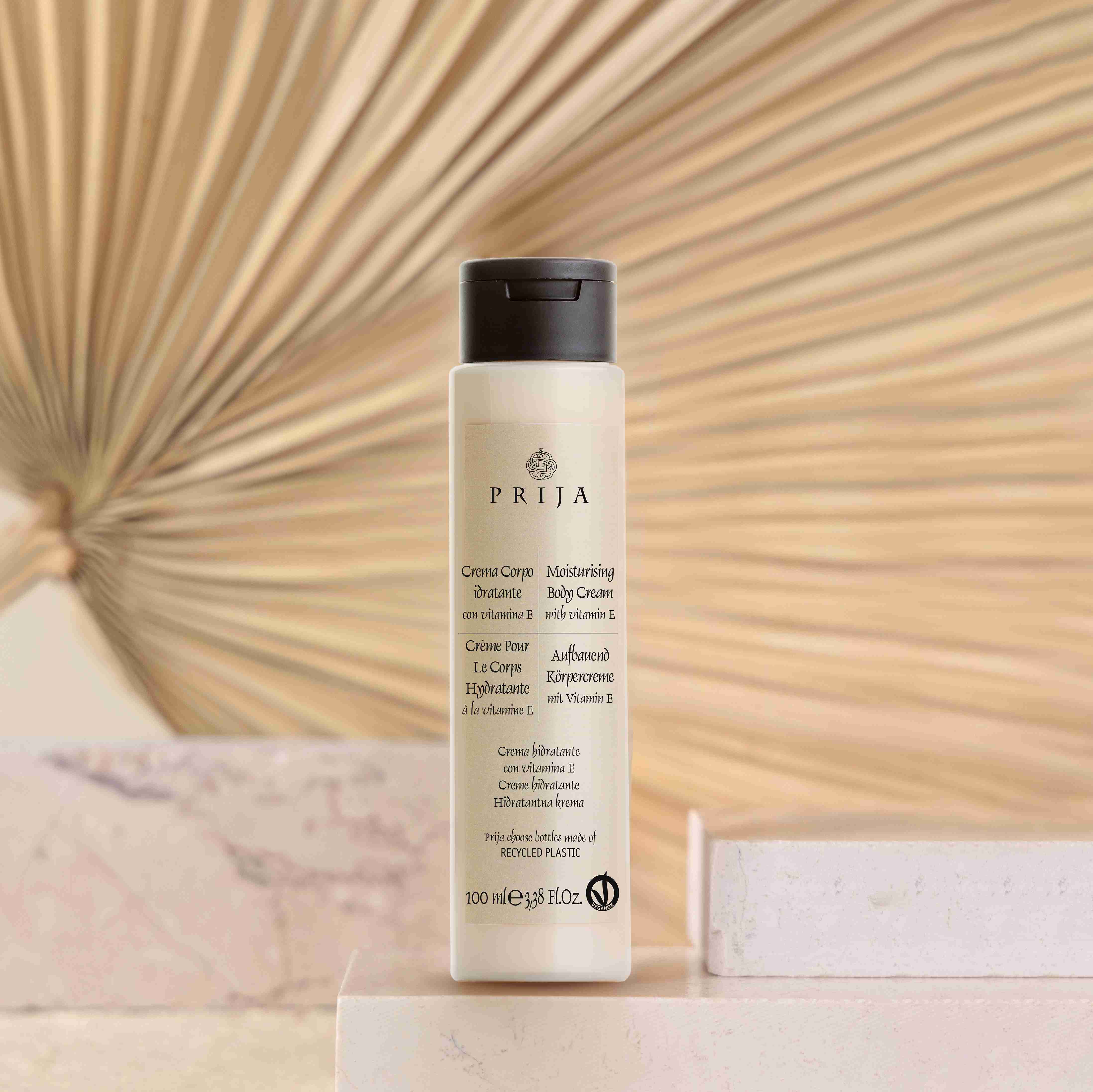 Moisturizing hand and body cream, VEGANOK certified, with Vitamin E. It creates a moisture barrier that ensures long-lasting soft and silky skin.