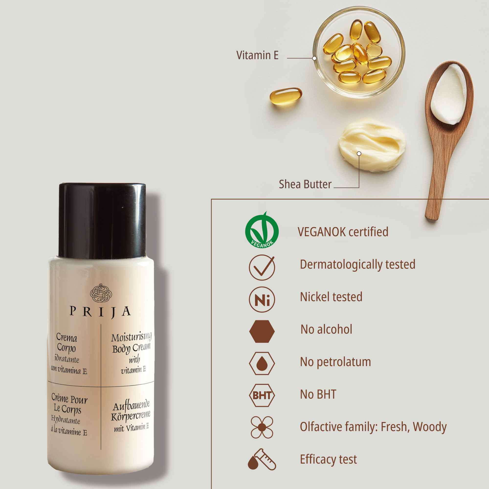 Moisturising hand and body cream, VEGANOK certified, with Vitamin E. It creates a moisture barrier that ensures long-lasting soft and silky skin.