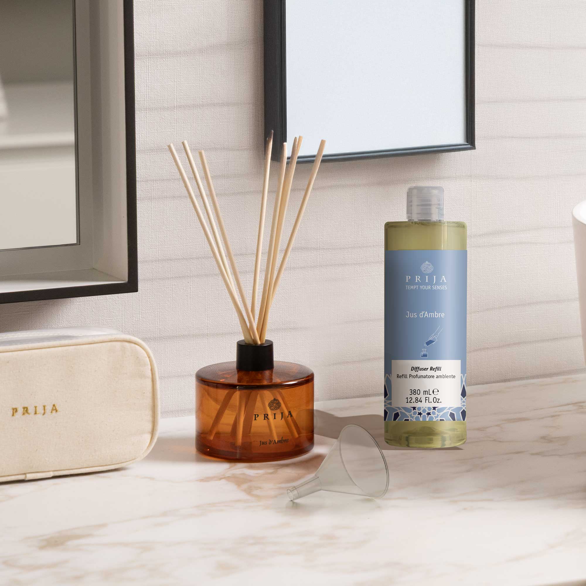 Infused with Jus d’Ambre, Prija’s iconic fragrance, this elegant diffuser transforms any space into a sanctuary of calm and quiet luxury.