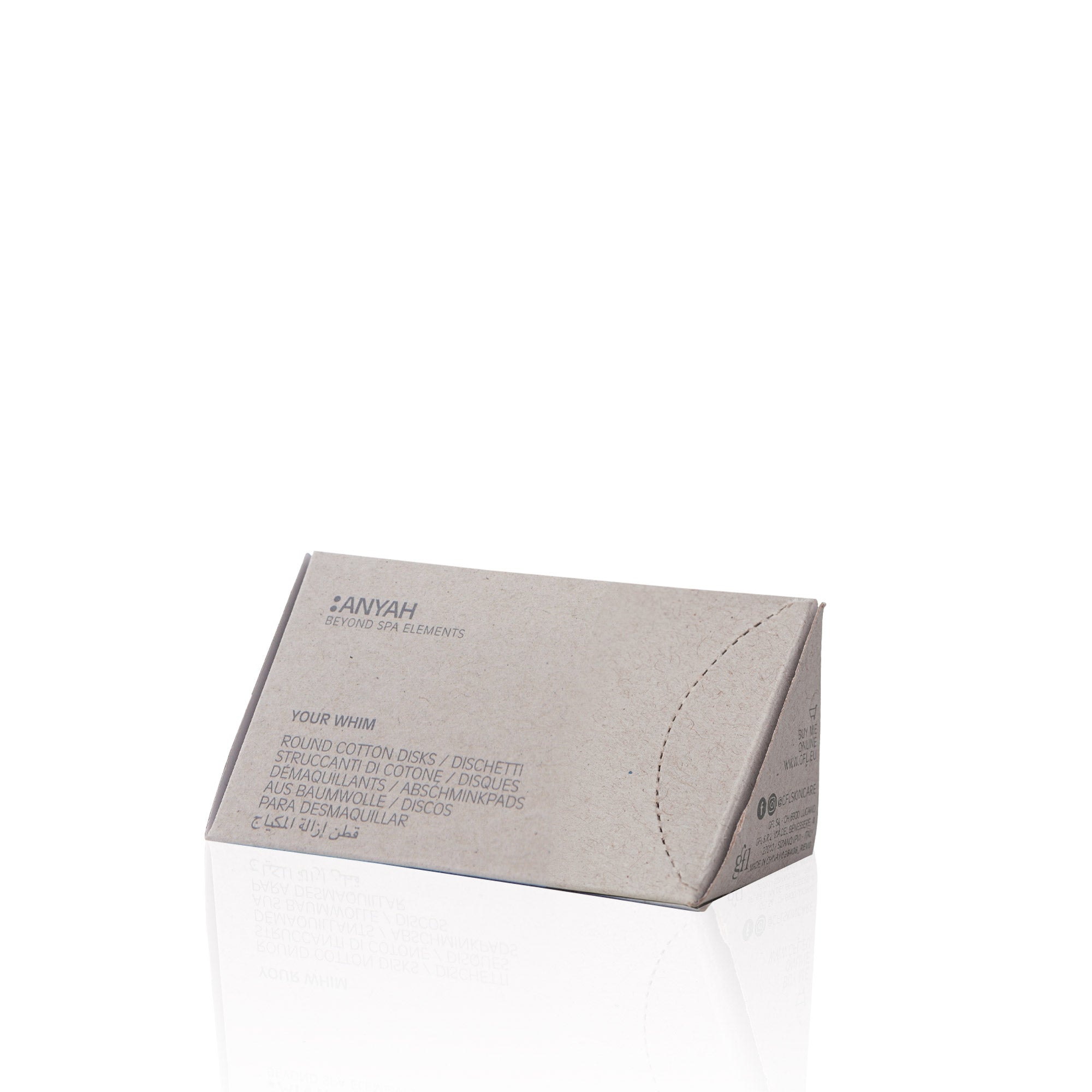 3 round cotton pads in prisma box in recycled paper sealed with precut.