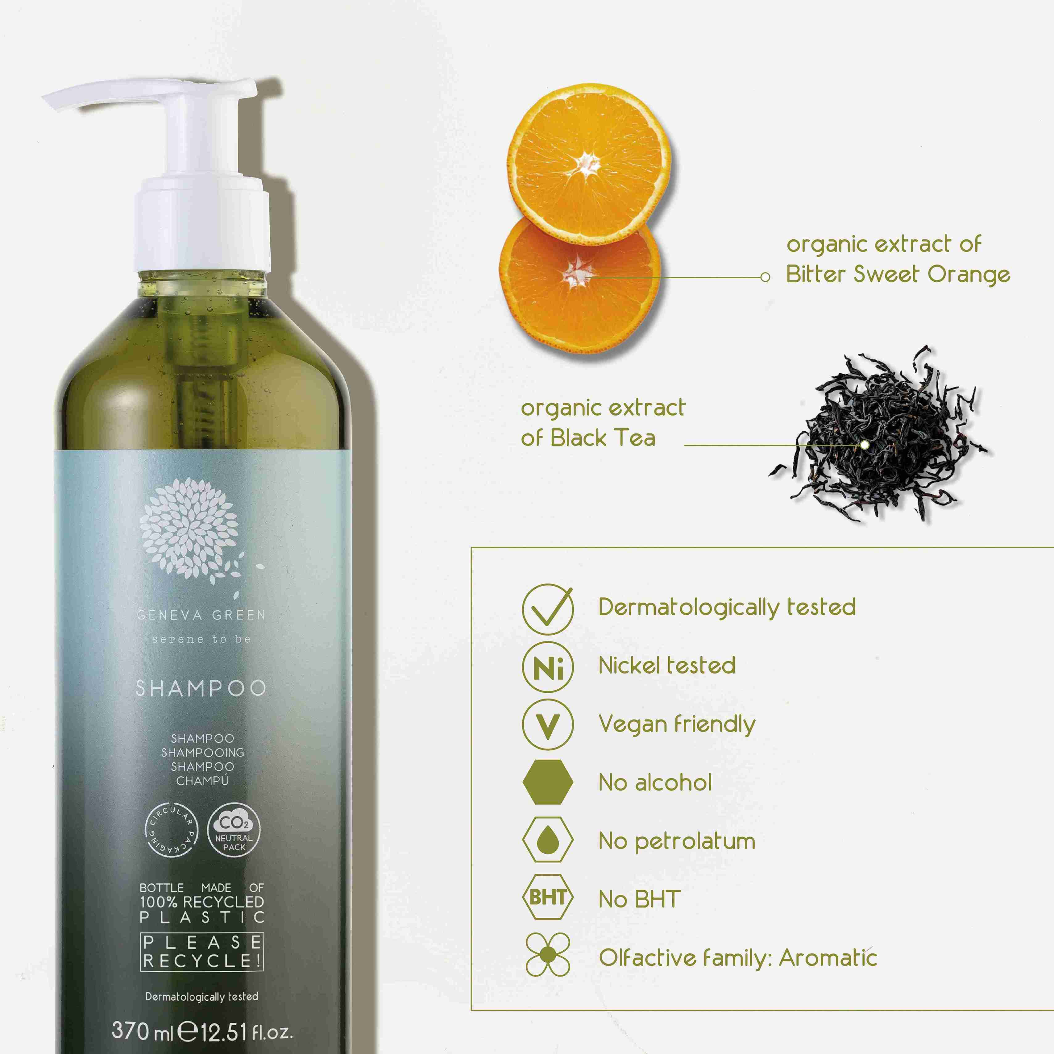Geneva Green shampoo is enriched with organic extract of Black Tea and Bitter Sweet Orange.