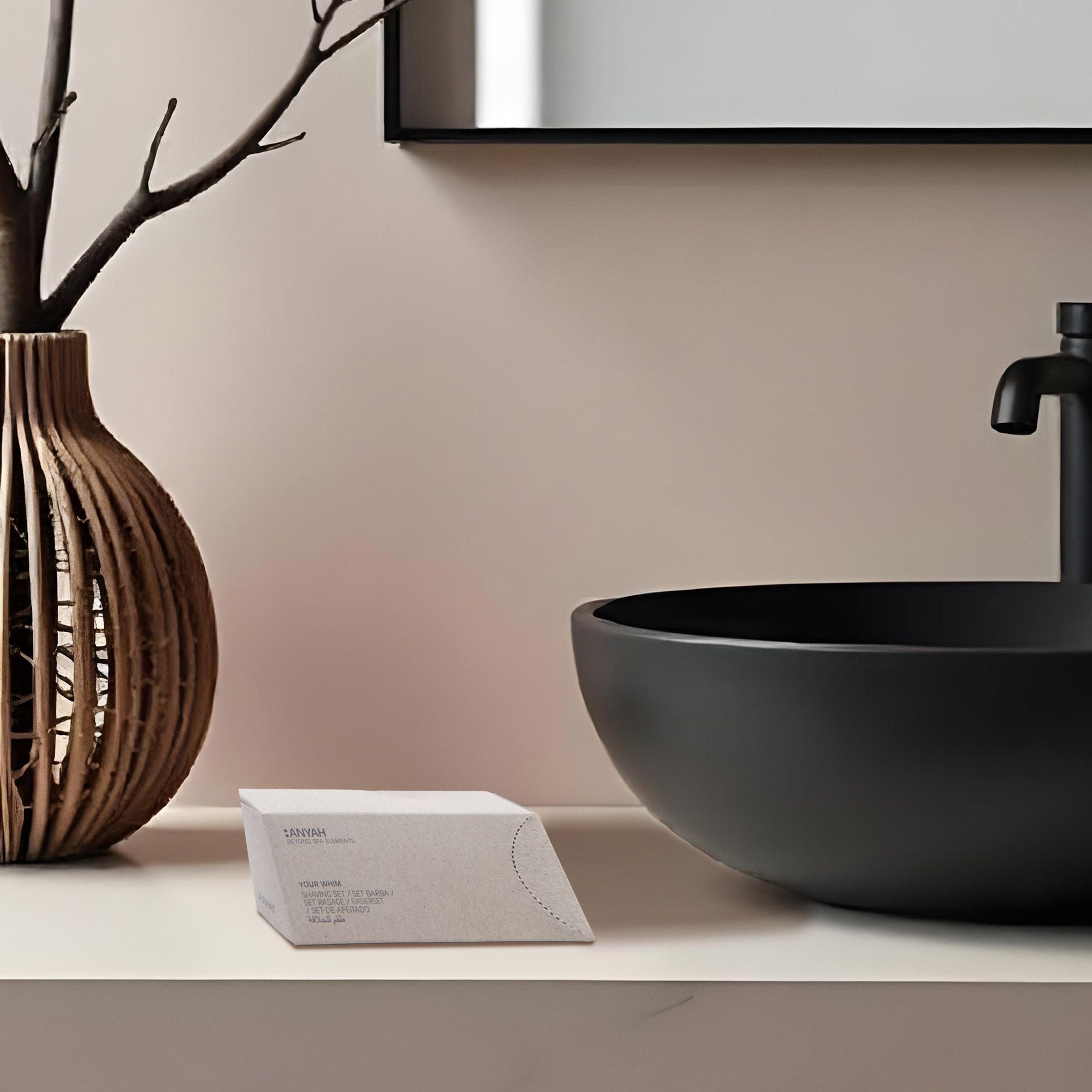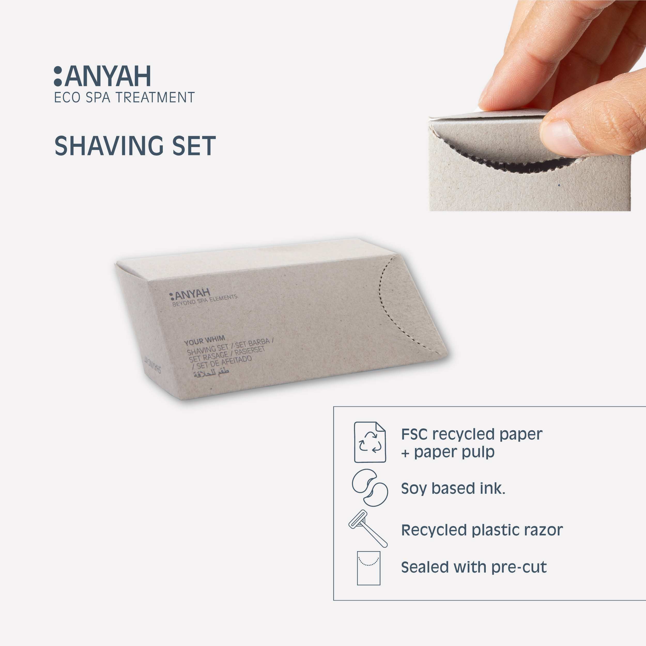 Shaving kit in prisma box in recycled paper sealed with precut.