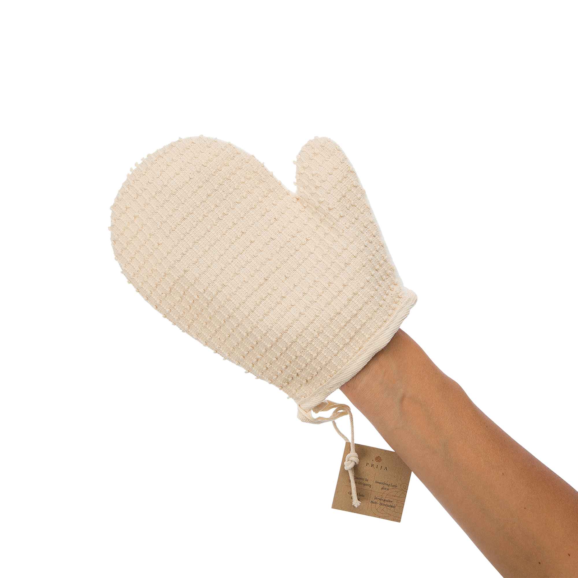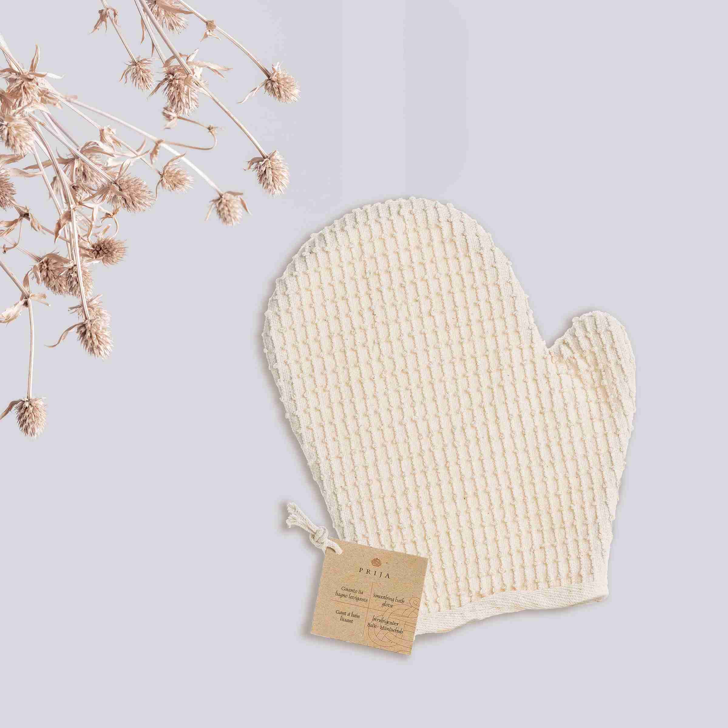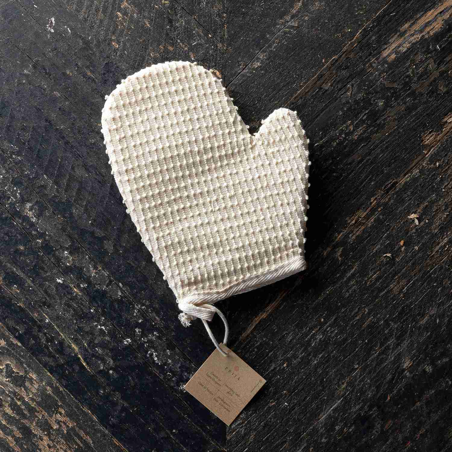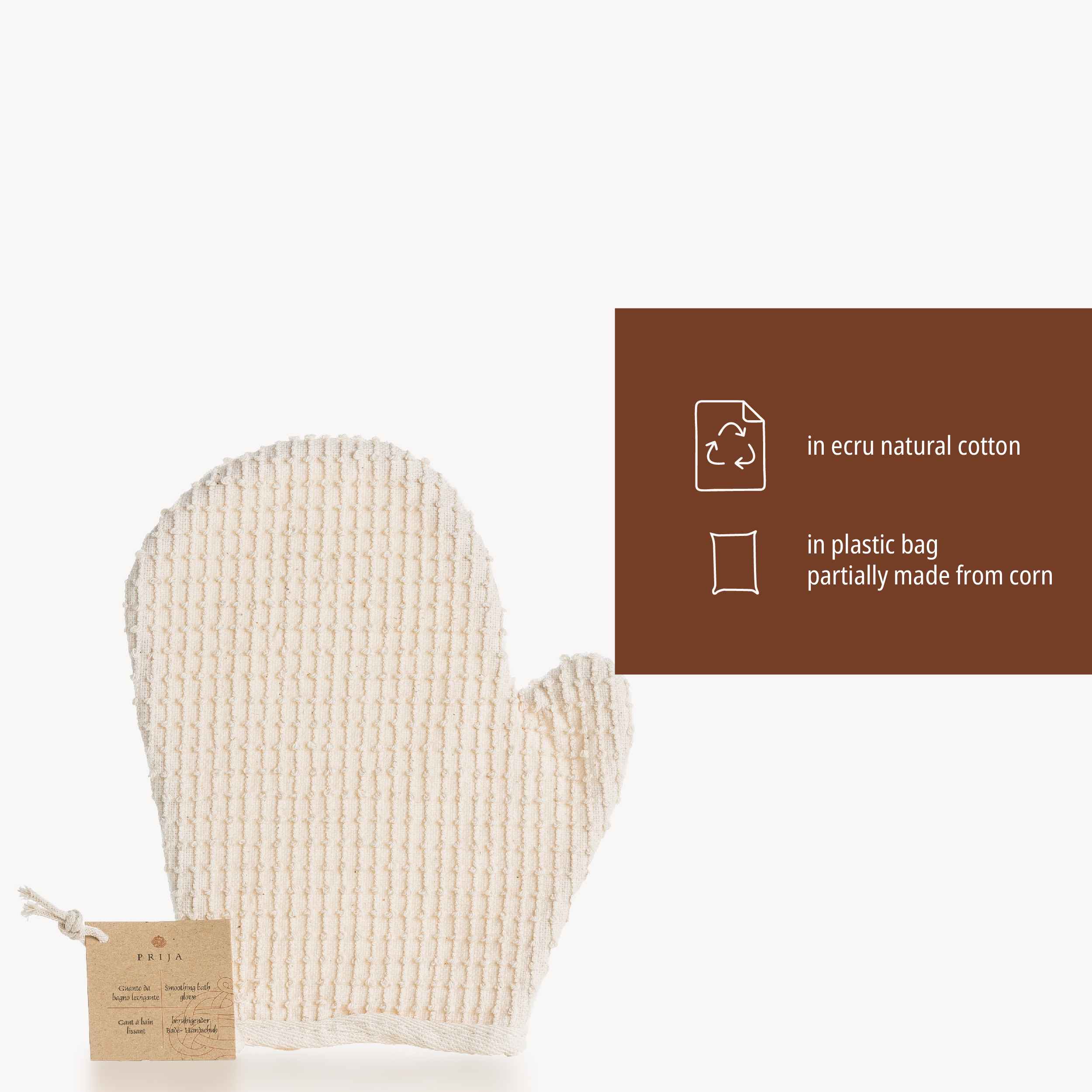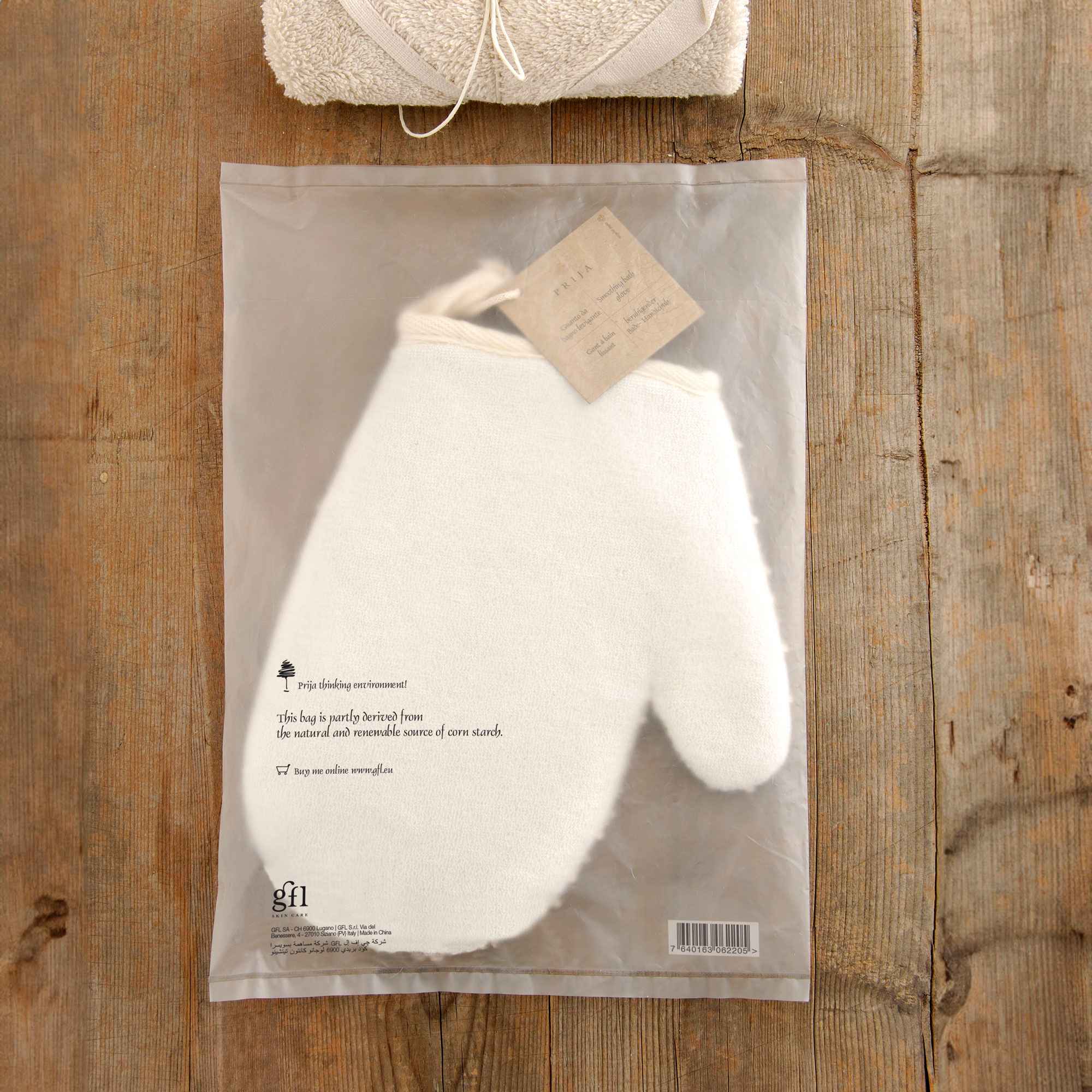 Smoothing bath glove in natural cotton, in bag partly derived from corn starch.