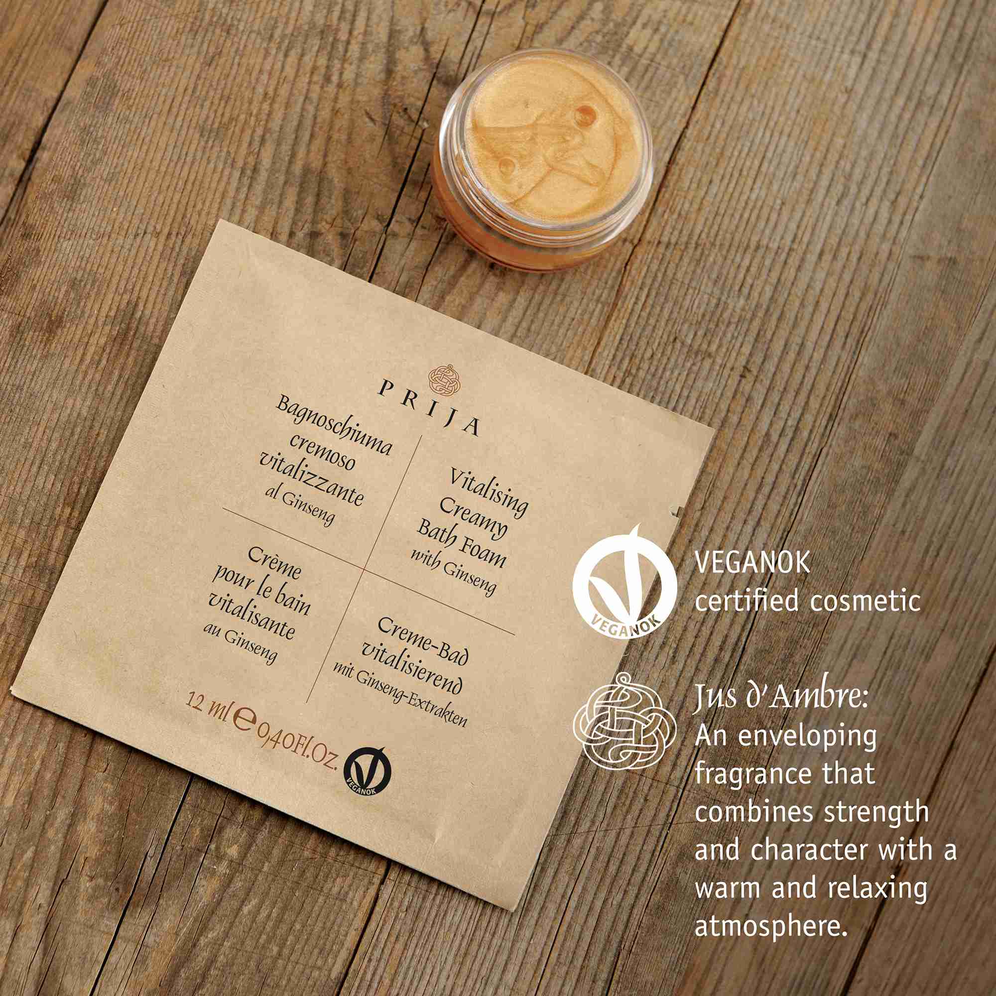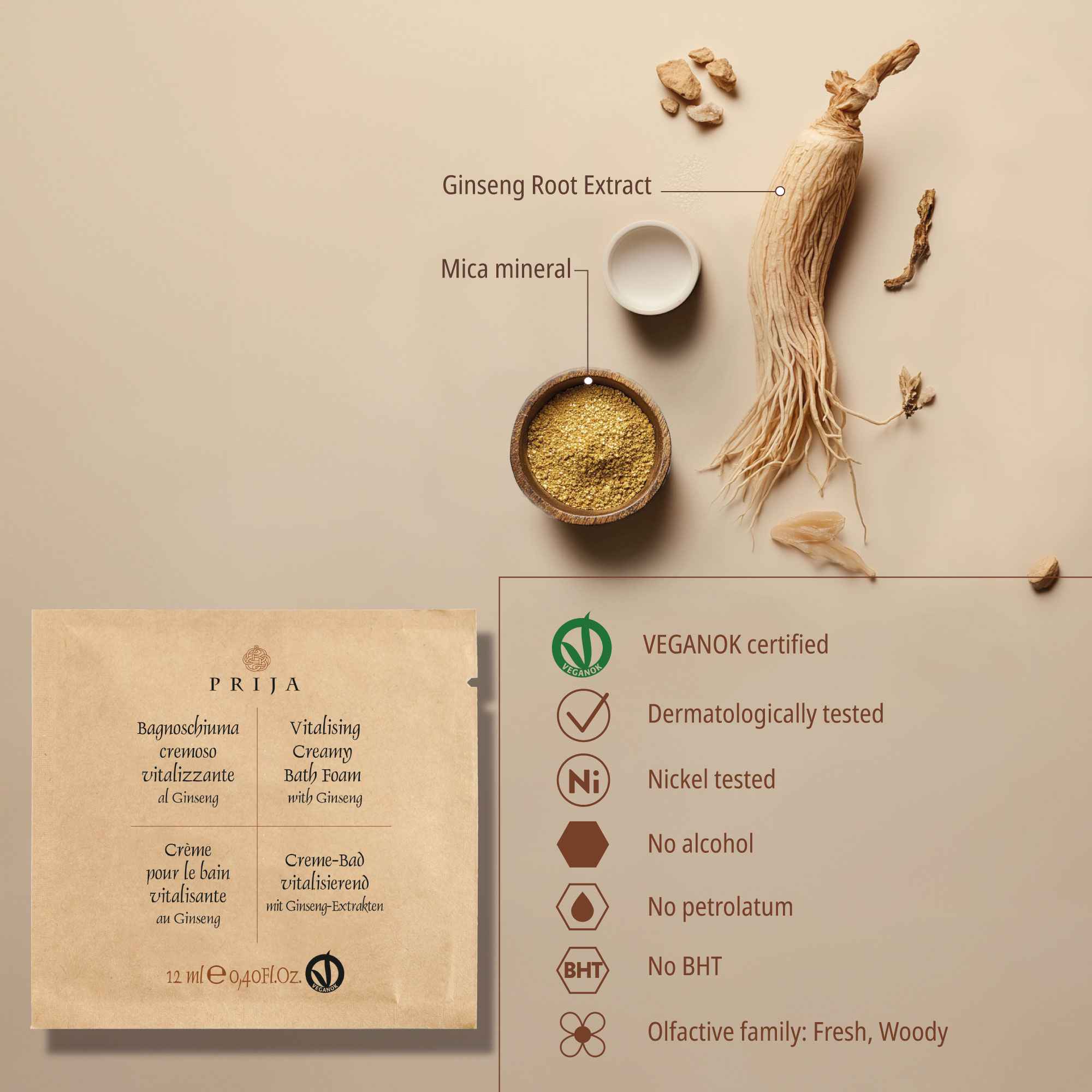 Vitalising creamy bath foam with Ginseng and a pearly texture. Its enveloping scent stimulates the skin with energy and vitality.