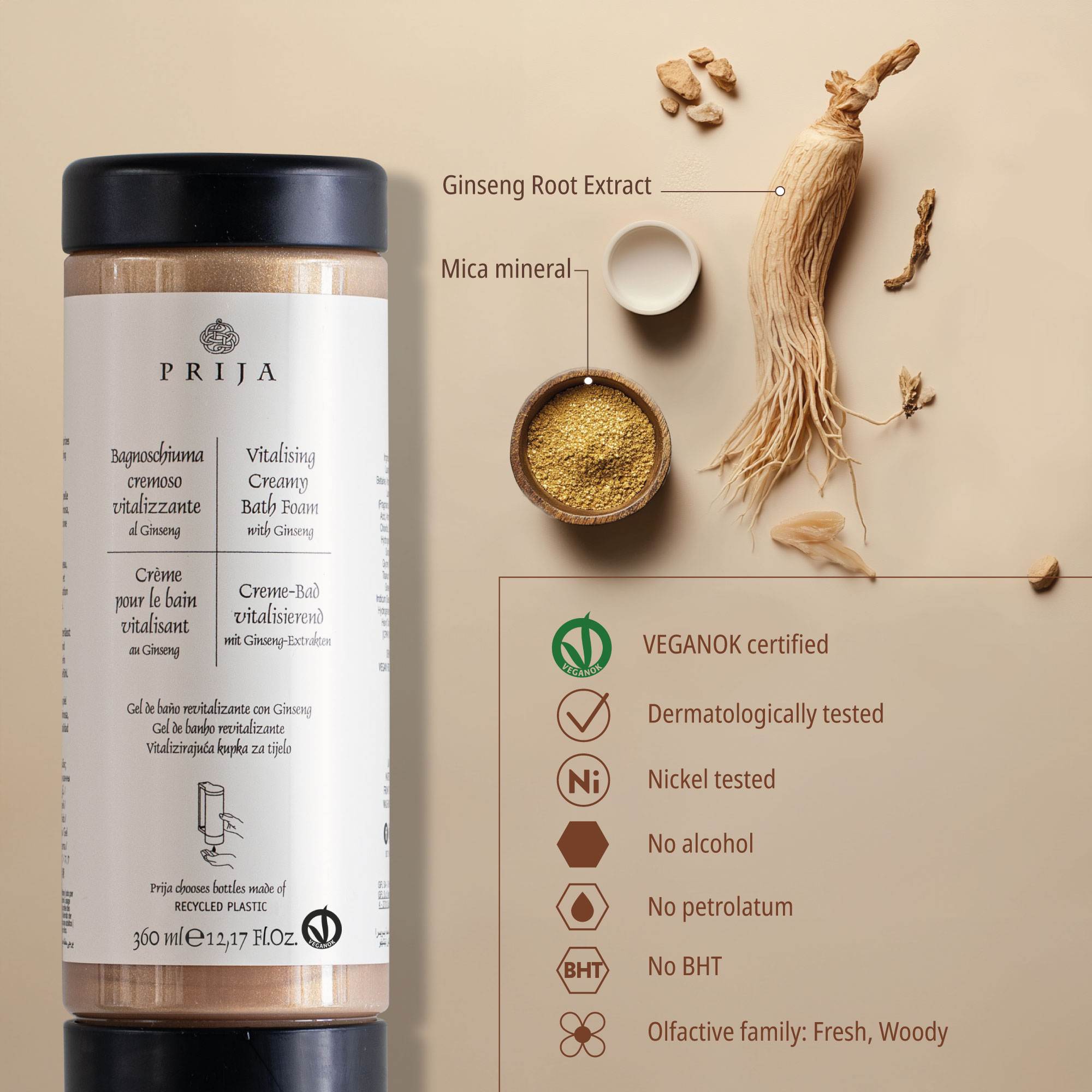 Vitalising creamy bath foam with Ginseng and a pearly texture. Its enveloping scent stimulates the skin with energy and vitality.