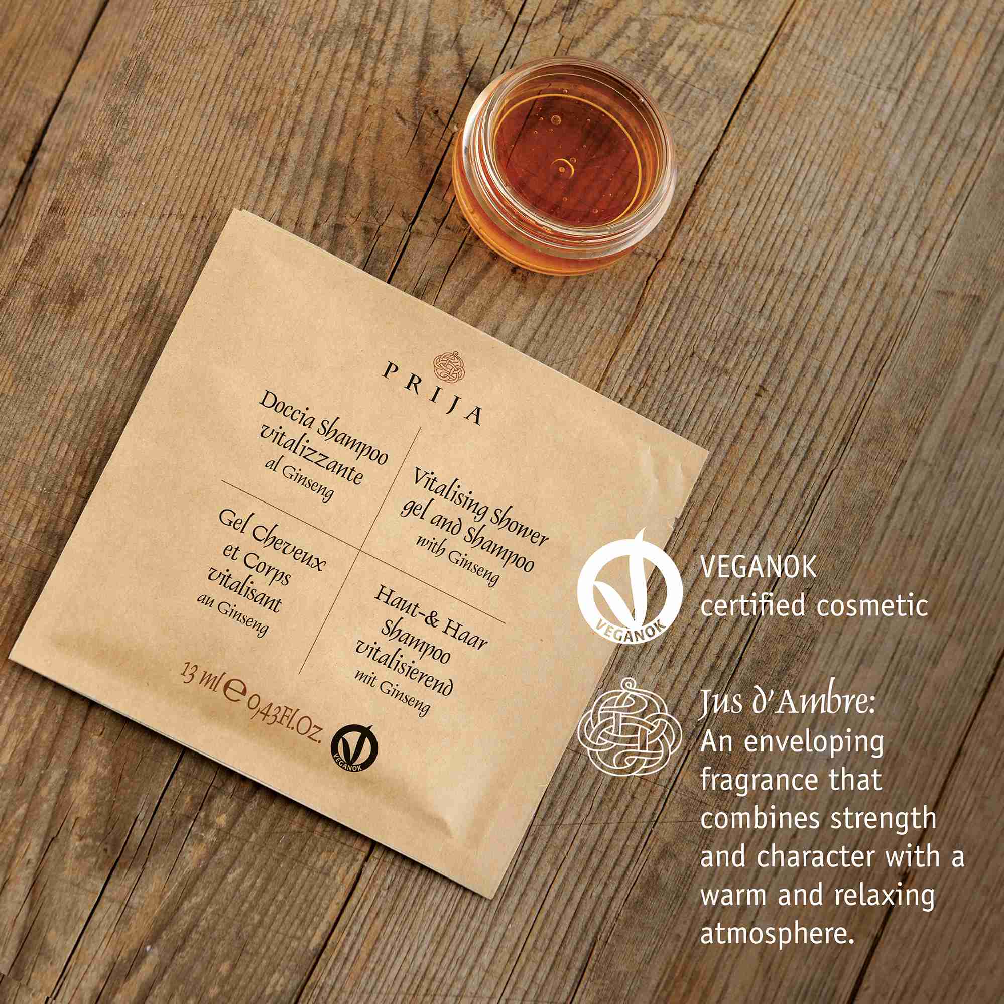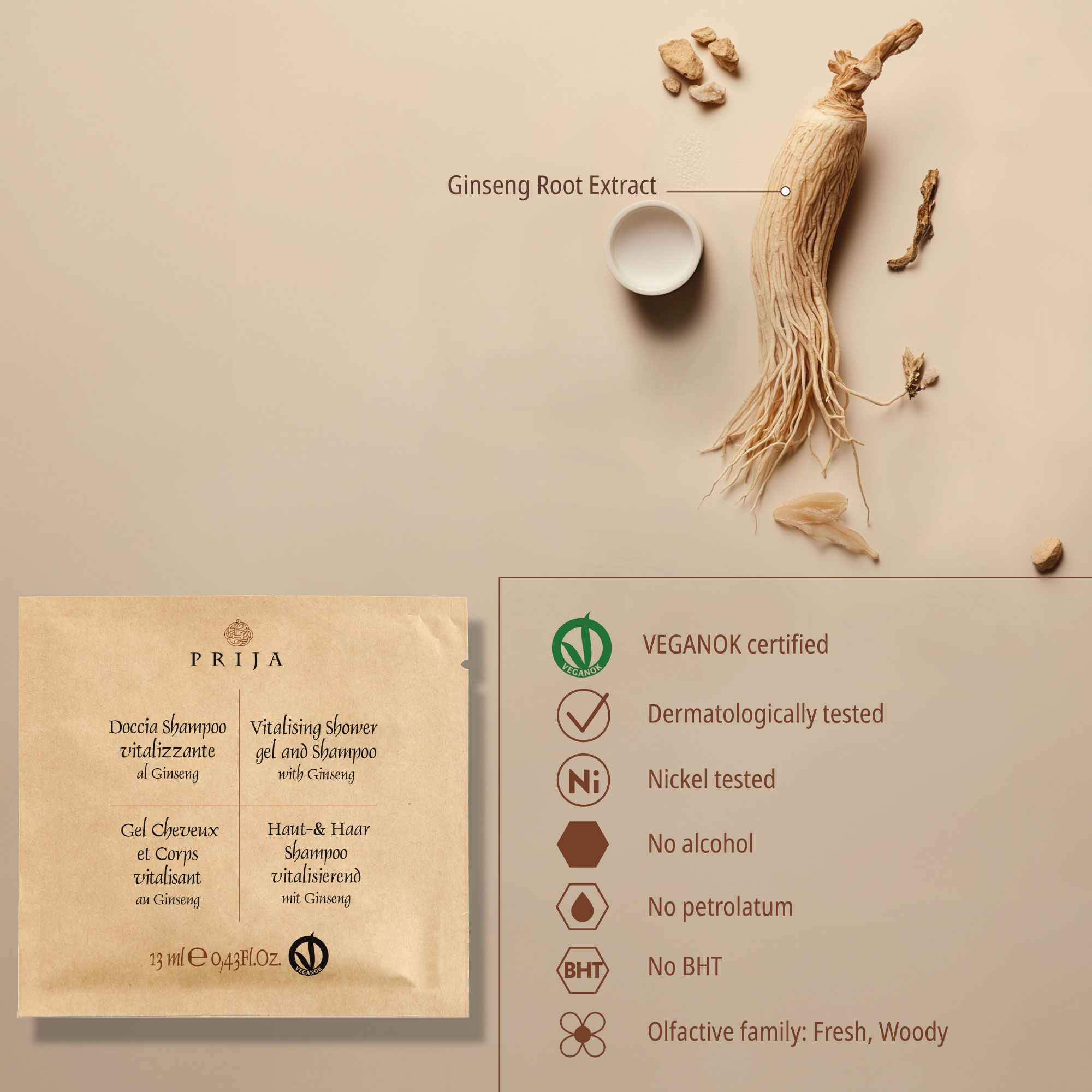 Vitalising body and hair cleanser with Ginseng. Gently cleanses the skin and scalp with the enveloping fragrance of Prija, with an immediate sensation of vitality and well-being all over the body.